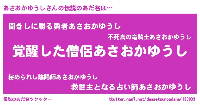 | 女子向けラノベタイトル風あだ名 | 『あさおかゆうし様がみてる』 |