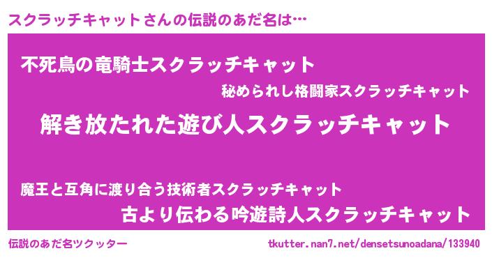 | 男性向けラノベタイトル風あだ名 | 『魔弾の王とスクラッチキャット』 |