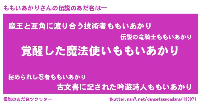 | 男性向けラノベタイトル風あだ名 | 『ももいあかりの嫁は女の子じゃないと思った?』 |