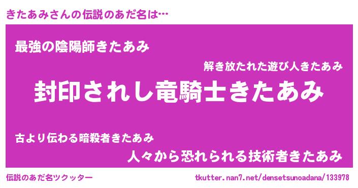 | 意味不明あだ名 | 『住所不定無職きたあみ(2歳)』 |