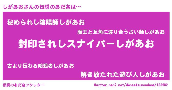 | 男性向けラノベタイトル風あだ名 | 『しがあおに滅ぼされるだけの簡単なお仕事です』 |