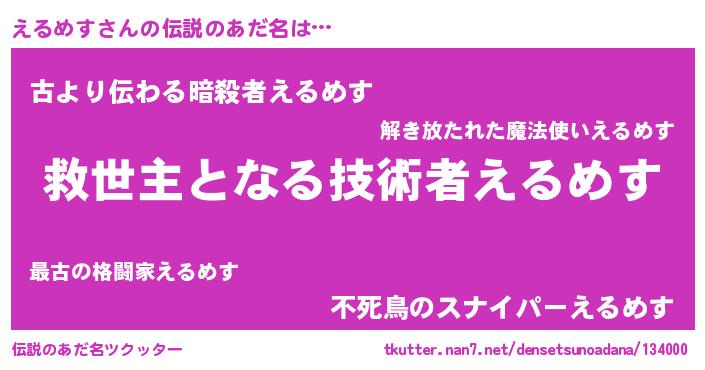 | ヒーロー風カッコイイあだ名 | 『天空の使者えるめす』『ネオエルメス』 |