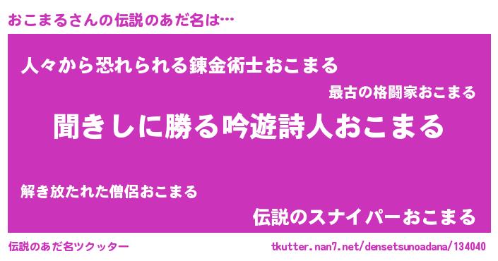 | 男性向けラノベタイトル風あだ名 | 『おこまるという概念が存在しない退屈な世界 』 |