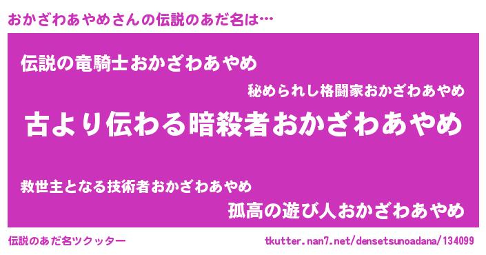 | 胡散臭い通販商品みたいなあだ名 | 『来世でも幸せになれる健康食品…その名も「おかざわあやめ」』 |