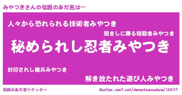 | ヘコむあだ名 | 『牛乳』『みやお』『みやつき(苦笑)』 |