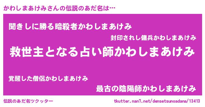 | 男性向けラノベタイトル風あだ名 | 『ノーゲーム・ノーカワシマアケミ』 |