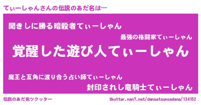 | 男性向けラノベタイトル風あだ名 | 『てぃーしゃんの嫁は女の子じゃないと思った?』 |