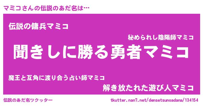 | 女子向けラノベタイトル風あだ名 | 『異世界で失敗しない100のマミコ』 |
