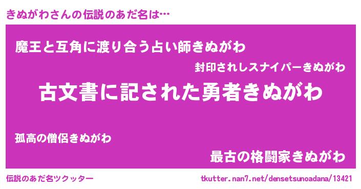 | 意味不明あだ名 | 『住所不定無職きぬがわ(86歳)』 |
