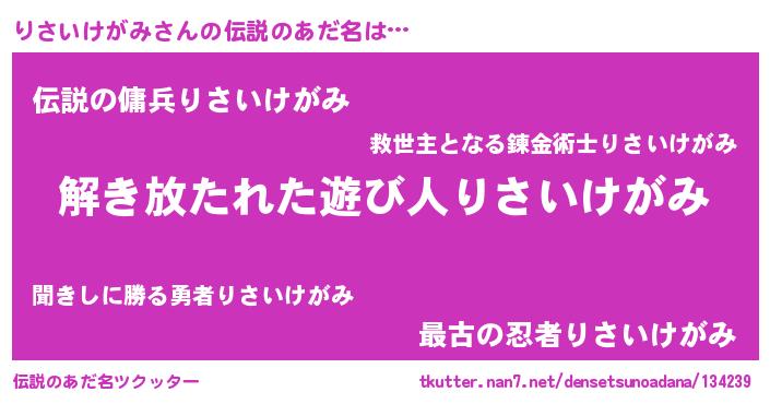 | 男性向けラノベタイトル風あだ名 | 『りさいけがみの嫁は女の子じゃないと思った?』 |
