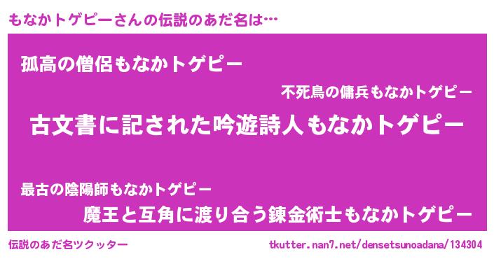 | 男性向けラノベタイトル風あだ名 | 『この素晴らしい世界にもなかトゲピーを!』 |