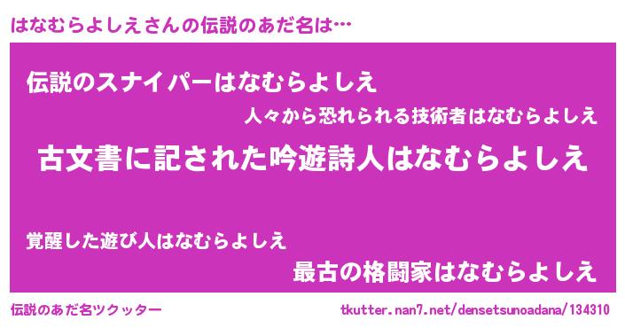 | ヘコむあだ名 | 『はなむらよしえ(笑)』『はなもー』 |