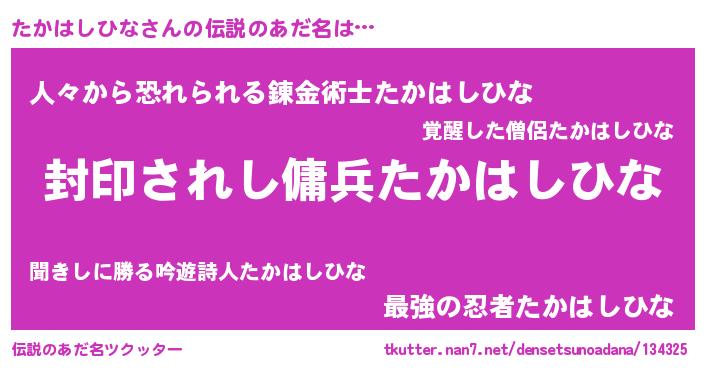| 男性向けラノベタイトル風あだ名 | 『タカハシヒナアートオンライン』 |