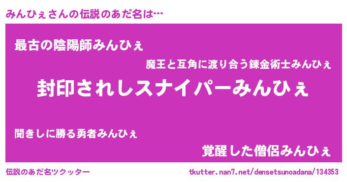 | 意味不明あだ名 | 『ペロリンみんひぇ』『自称みんひぇ』 |