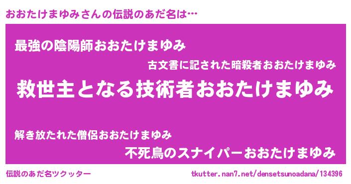 | 男性向けラノベタイトル風あだ名 | 『ノーゲーム・ノーオオタケマユミ』 |