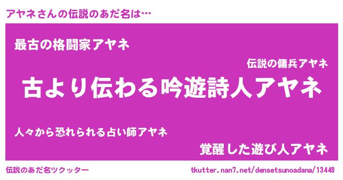 | 男性向けラノベタイトル風あだ名 | 『アヤネという概念が存在しない退屈な世界 』 |