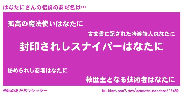 | 男性向けラノベタイトル風あだ名 | 『はなたにに滅ぼされるだけの簡単なお仕事です』 |