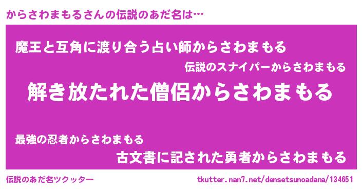 | 男性向けラノベタイトル風あだ名 | 『からさわまもるの嫁は女の子じゃないと思った?』 |