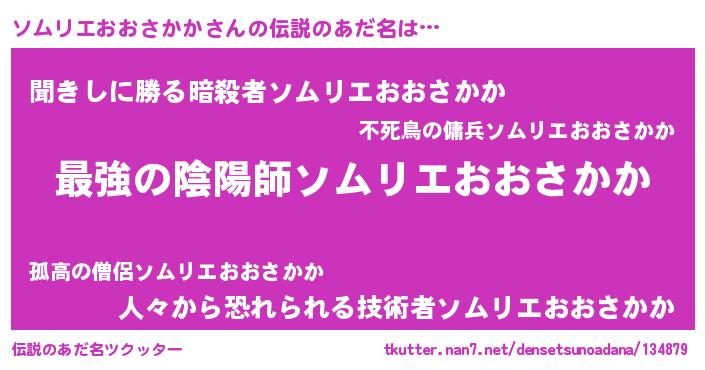 | 男性向けラノベタイトル風あだ名 | 『ソムリエおおさかか~年齢イコール彼女いない歴の魔法使い~』 |