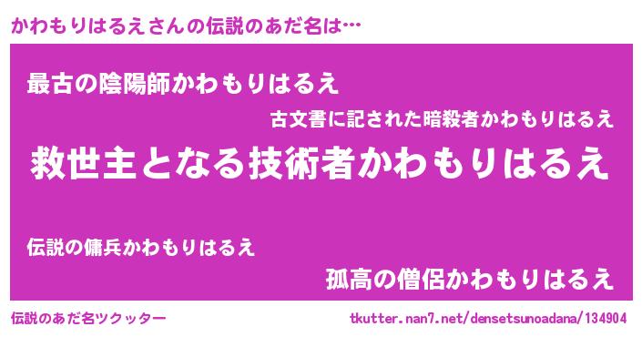 | 男性向けラノベタイトル風あだ名 | 『かわもりはるえに滅ぼされるだけの簡単なお仕事です』 |
