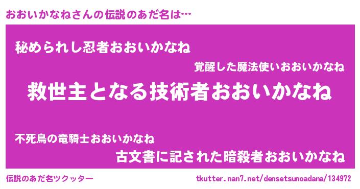 | 男性向けラノベタイトル風あだ名 | 『おおいかなねに滅ぼされるだけの簡単なお仕事です』 |