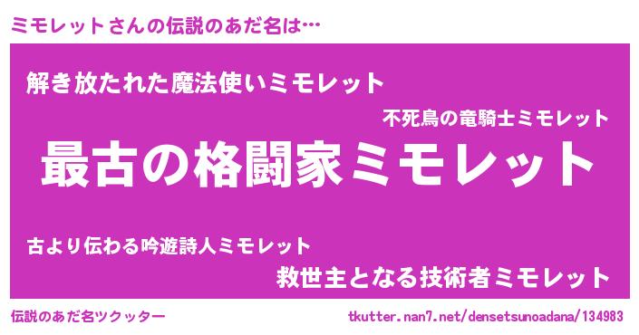 | 意味不明あだ名 | 『住所不定無職ミモレット(7歳)』 |