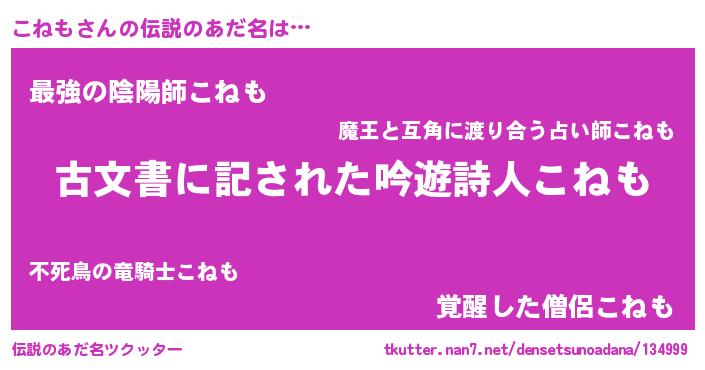 | 男性向けラノベタイトル風あだ名 | 『この素晴らしい世界にこねもを!』 |