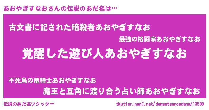 | 男性向けラノベタイトル風あだ名 | 『あおやぎすなおに滅ぼされるだけの簡単なお仕事です』 |