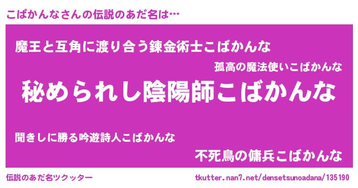 | 男性向けラノベタイトル風あだ名 | 『魔弾の王とこばかんな』 |
