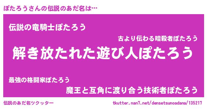 | 男性向けラノベタイトル風あだ名 | 『ぽたろうの嫁は女の子じゃないと思った?』 |