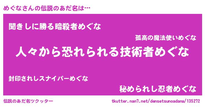 | 意味不明あだ名 | 『めかぶ科めぐな属』『自称めぐな』 |