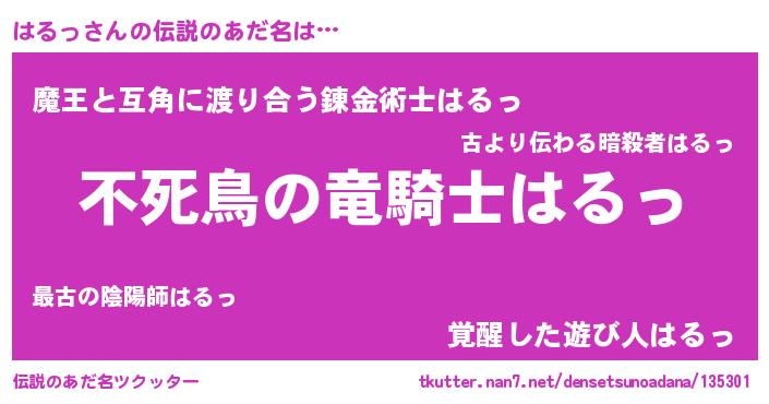 | 男性向けラノベタイトル風あだ名 | 『この素晴らしい世界にはるっを!』 |