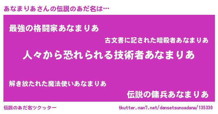 | 意味不明あだ名 | 『住所不定無職あなまりあ(1歳)』 |