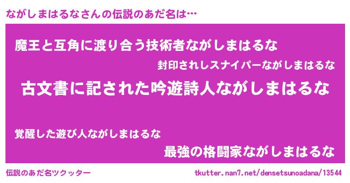 | 男性向けラノベタイトル風あだ名 | 『ながしまはるな~年齢イコール彼女いない歴の魔法使い~』 |