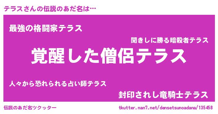 | 意味不明あだ名 | 『とにかく怪しいテラス』『自称テラス』 |
