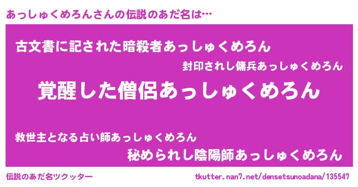 | 女子向けラノベタイトル風あだ名 | 『あっしゅくめろん様がみてる』 |