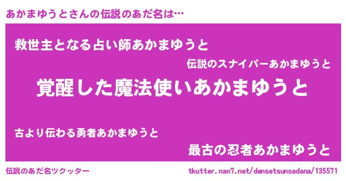 | 男性向けラノベタイトル風あだ名 | 『あかまゆうとの嫁は女の子じゃないと思った?』 |