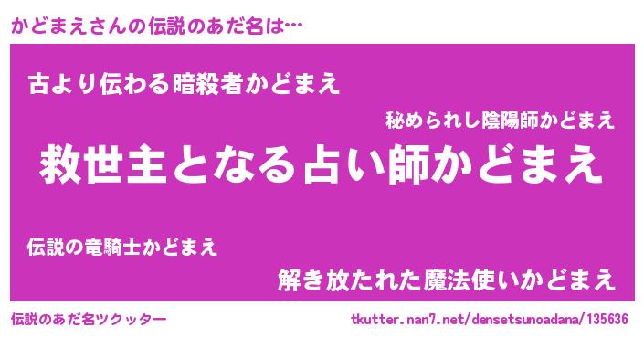| 男性向けラノベタイトル風あだ名 | 『かどまえに滅ぼされるだけの簡単なお仕事です』 |