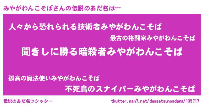 | 胡散臭い通販商品みたいなあだ名 | 『絶対に幸福をもたらす健康食品…その名も「みやがわんこそば」』 |