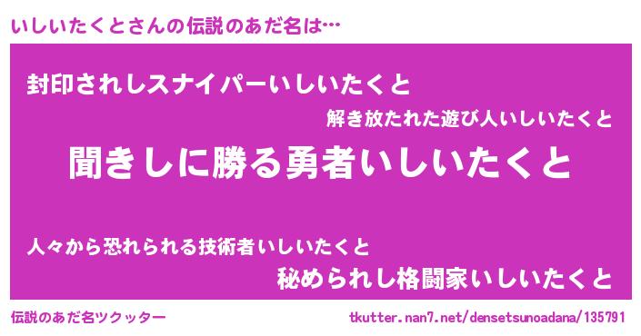 | 意味不明あだ名 | 『住所不定無職いしいたくと(93歳)』 |