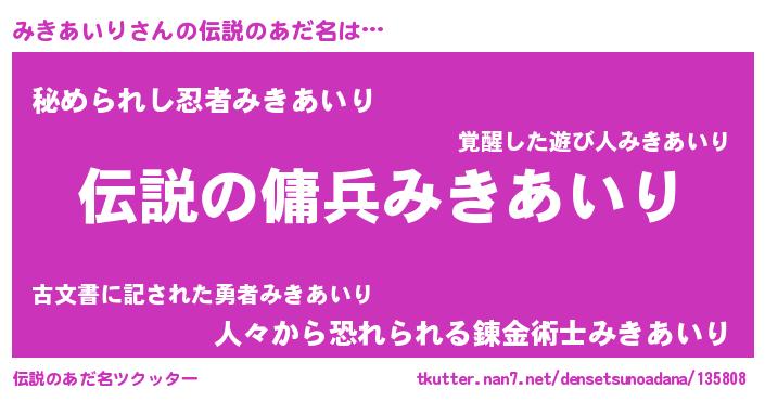 | 意味不明あだ名 | 『自称みきあいり』『ペロリンみきあいり』 |