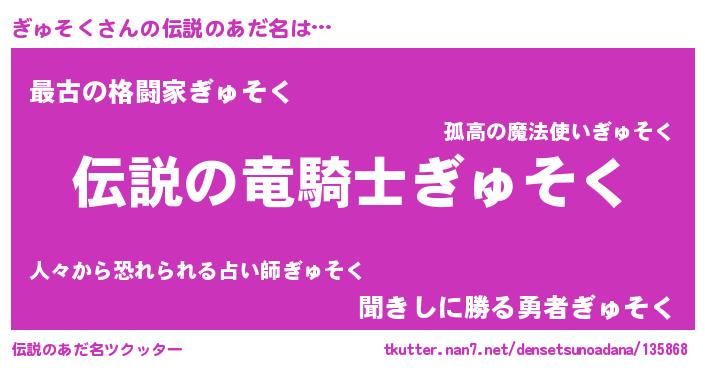 | 男性向けラノベタイトル風あだ名 | 『ぎゅそくの憂鬱』『魔弾の王とぎゅそく』 |