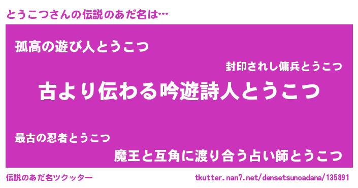 | ヒーロー風カッコイイあだ名 | 『ネオトウコツ』『黄金騎士トウ』 |