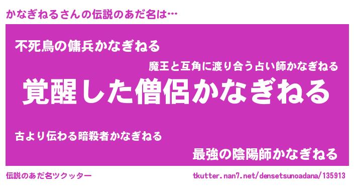 | 男性向けラノベタイトル風あだ名 | 『かなぎねるの嫁は女の子じゃないと思った?』 |