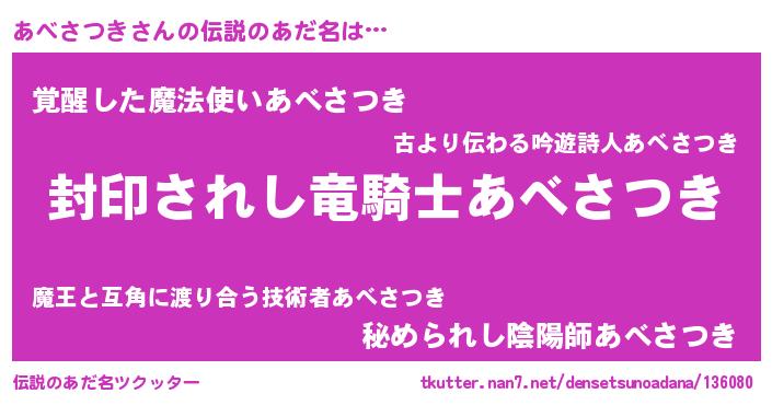 | 男性向けラノベタイトル風あだ名 | 『アベサツキアートオンライン』 |