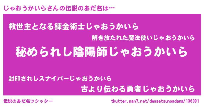 | 男性向けラノベタイトル風あだ名 | 『魔法科高校のじゃおうかいら』 |
