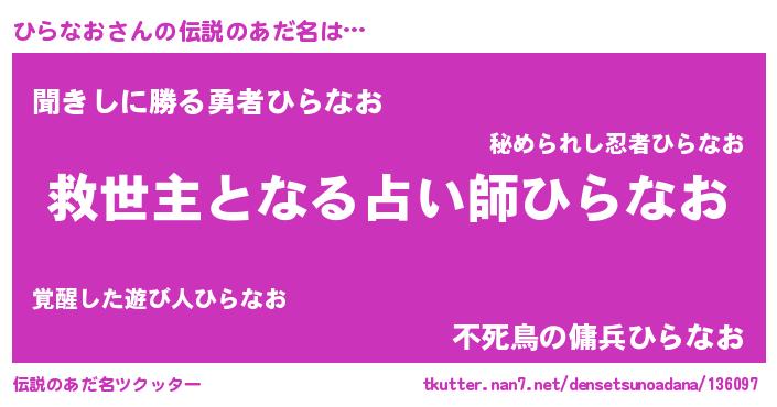 | 男性向けラノベタイトル風あだ名 | 『ノーゲーム・ノーヒラナオ』 |