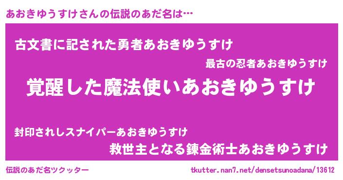| 男性向けラノベタイトル風あだ名 | 『あおきゆうすけの嫁は女の子じゃないと思った?』 |