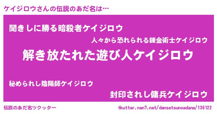 | ヒーロー風カッコイイあだ名 | 『仮面ケイダー』『暗黒騎士ケイ』 |