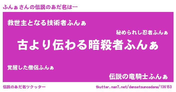 | 男性向けラノベタイトル風あだ名 | 『ふんぁという概念が存在しない退屈な世界 』 |